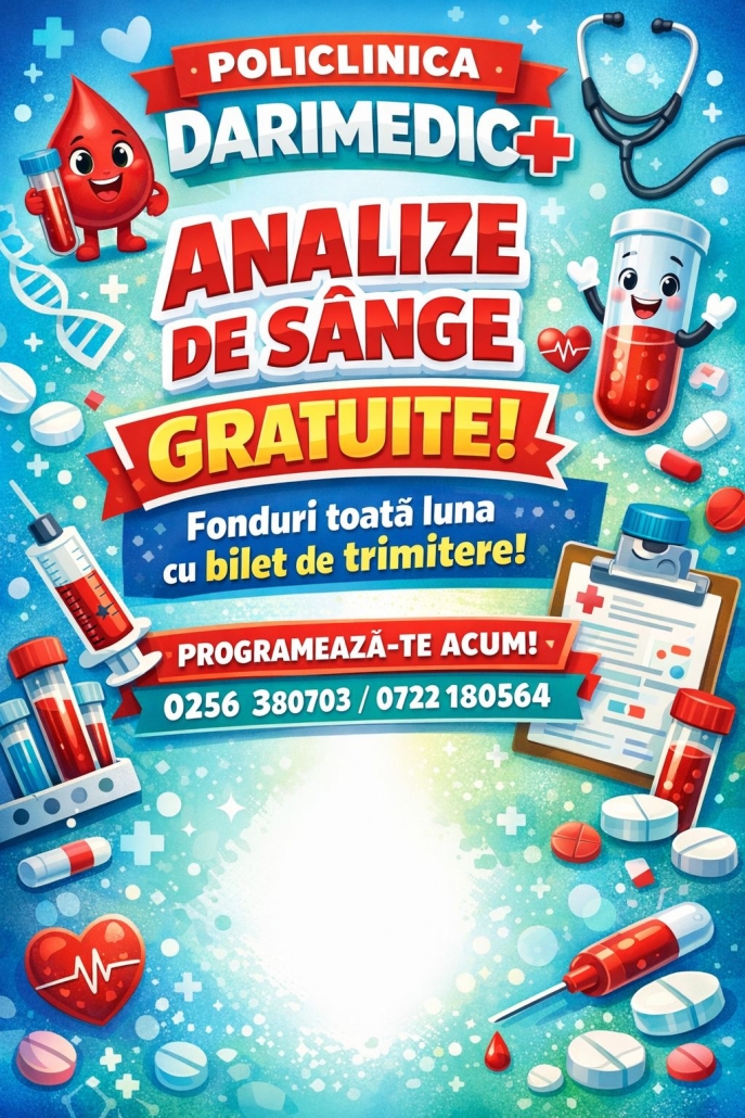 Analize de sange GRATUITE February 11, 2026/0 Comments/in Informativ /by darimedic https://darimedic.ro/wp-content/uploads/2026/02/WhatsApp-Imag.jpeg 1536 1024 darimedic https://darimedic.ro/wp-content/uploads/2022/08/logo-cu-anmcs.jpg darimedic2026-02-11 08:13:382026-02-11 08:13:38Analize de sange GRATUITE